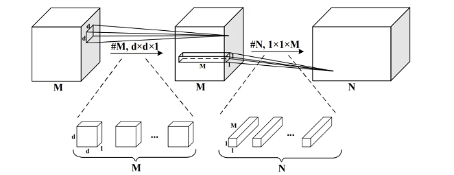 depth-wise convolution은 각 합성곱 커널을 입력의 하나의 채널에만 적용 후, 1 x 1 합성곱을 사용하여 depth-wise convolution의 출력을 결합한다.