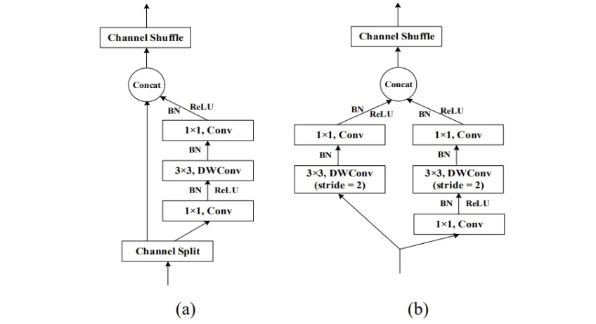 (b)는 1 x 1 컨볼루션을 계산이 더 효율적인 1 x 1 GConv로 교체하고 채널 셔플을 도입하였으며, 두 번째 ReLU를 지웠다.