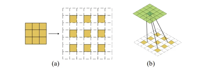 아래 그림 (a)와 같이, 입력이 3 x 3이고 출력의 크기가 3 x 3보다 크기를 기대하는 경우, 입력값 사이에 0을 삽입하여 3 x 3 입력을 확장할 수 있다.