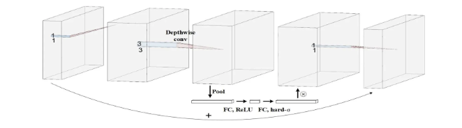 MobileNet v3는 Squeeze-and-Excitation (SE)을 활용하여 각 채널에 가충치를 부여하는 lightweight attention 모델을 구현했다. SE 모듈은 깊이별 분리 합성곱 수행 이후에 적용된다.