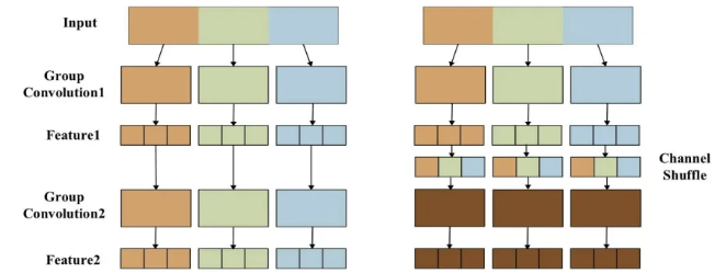 이에 따라 channel shuffle 연산이 제안되어, 서로 다른 그룹의 정보가 무작위로 다른 그룹으로 흐를 수 있도록 도와줬다.